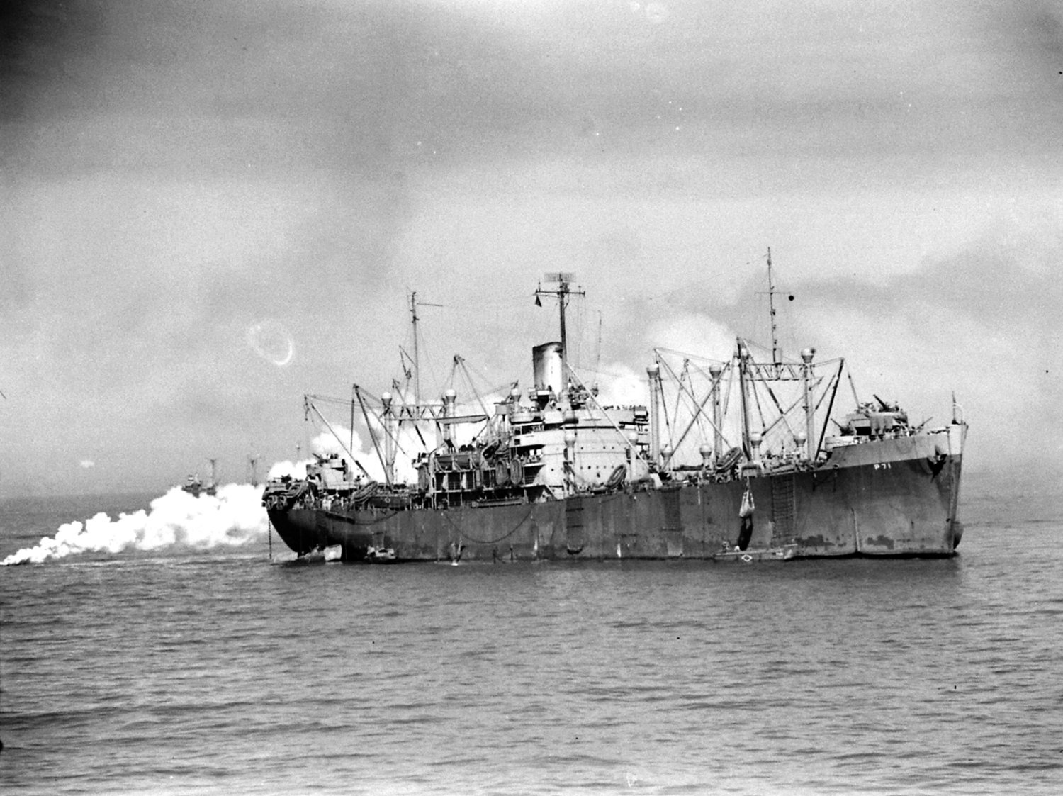 were fitted to her as a merchant ship and also of note is the 4"/50 gun at the stern on a platform just aft of and below the after pair of 3"/50 guns.