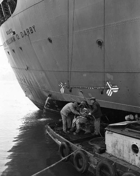 50k | Hard hat diver preparing to dive to inspect the under water hull of USNS General William O. Darby (T-AP-127), date and location unknown.