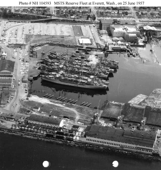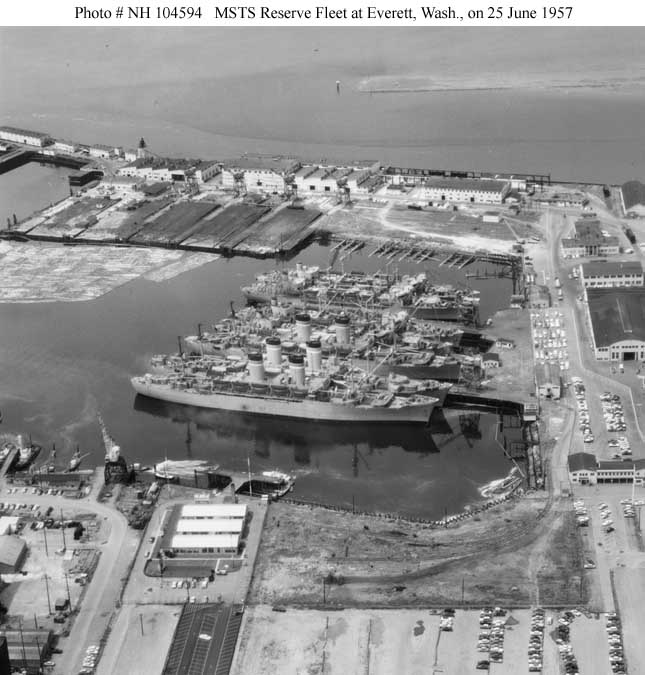 USNS General John Pope (T-AP-110), USNS General M. C. Meigs (T-AP-116), USNS General William Weigel (T-AP-119), USNS General R. L. Howze (T-AP-134), USNS Marine Phoenix (T-AP-195), USNS Marine Adder (T-AP-193), and USNS Marine Lynx (T-AP-194). They are in MSTS Ready Reserve status. All were moved to the Maritime Administration reserve fleets at Olympia and Astoria in 1958. During World War II this site was occupied by the Everett Pacific Shipbuilding and Drydock Co., which built net laying ships, non-self propelled barracks ships, self-propelled covered lighters and small harbor tugs. Larger ships were repaired at the piers where the MSTS ships were later moored. US Naval History and Heritage Command photo #'s NH 104591 and NH 104592 |