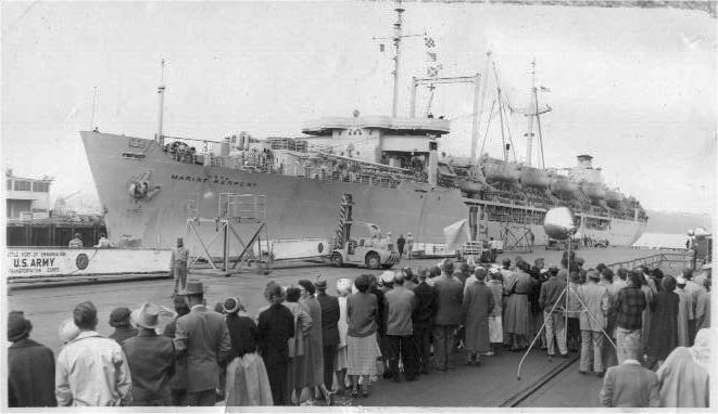 USNS Marine Serpent (T-AP-202) arriving/departing Seatle, WA., circa 1950s with GIs.