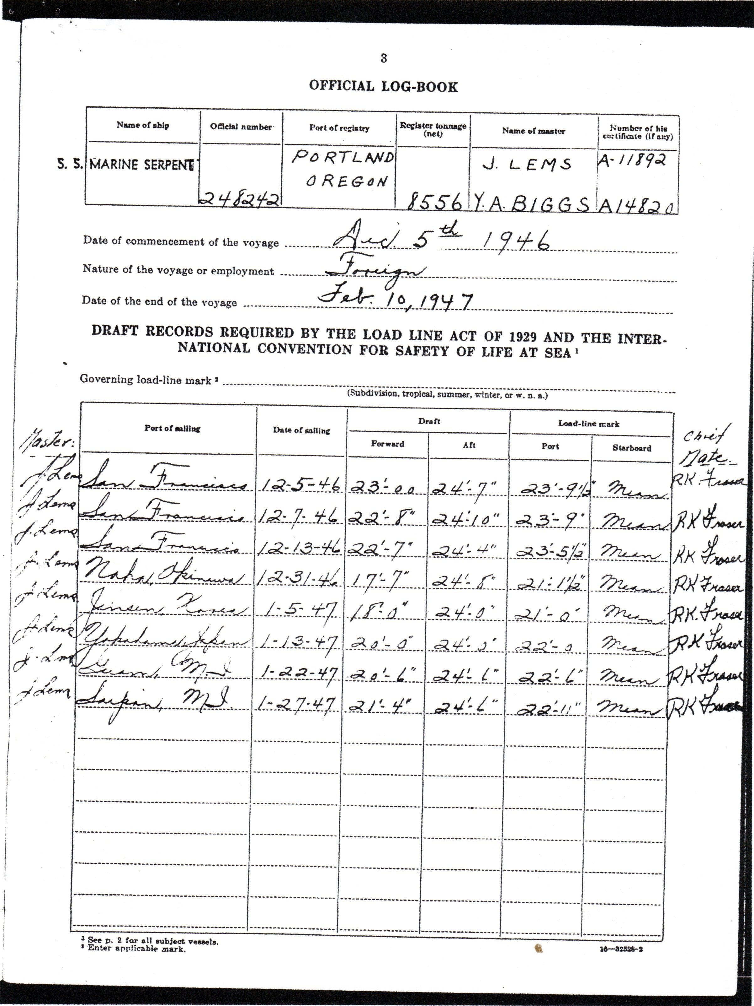 Cover and two sections of the Official Deck Log for SS Marine Serpent |