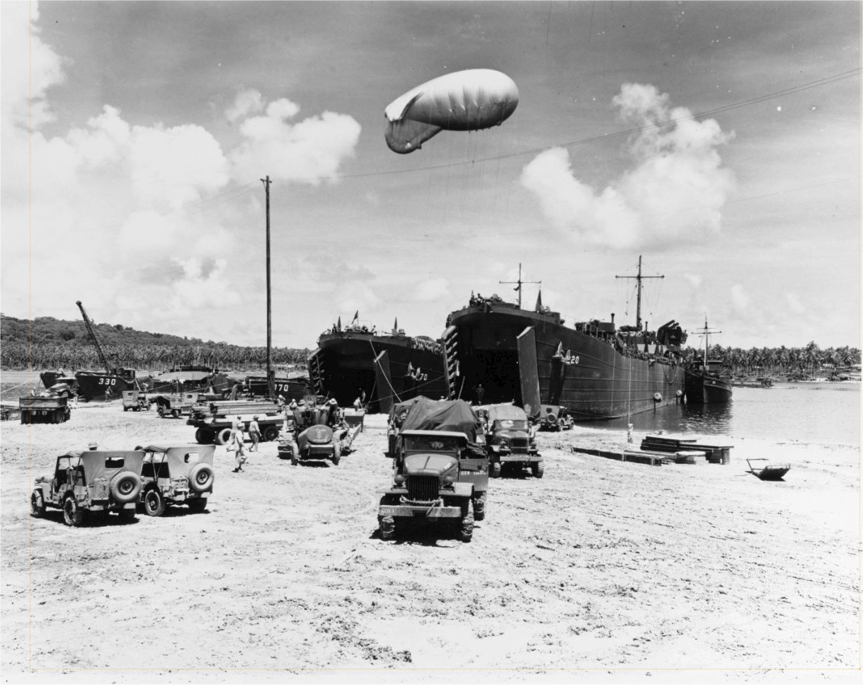 USS APc-50. Note trucks, Jeeps and Barrage Balloon.