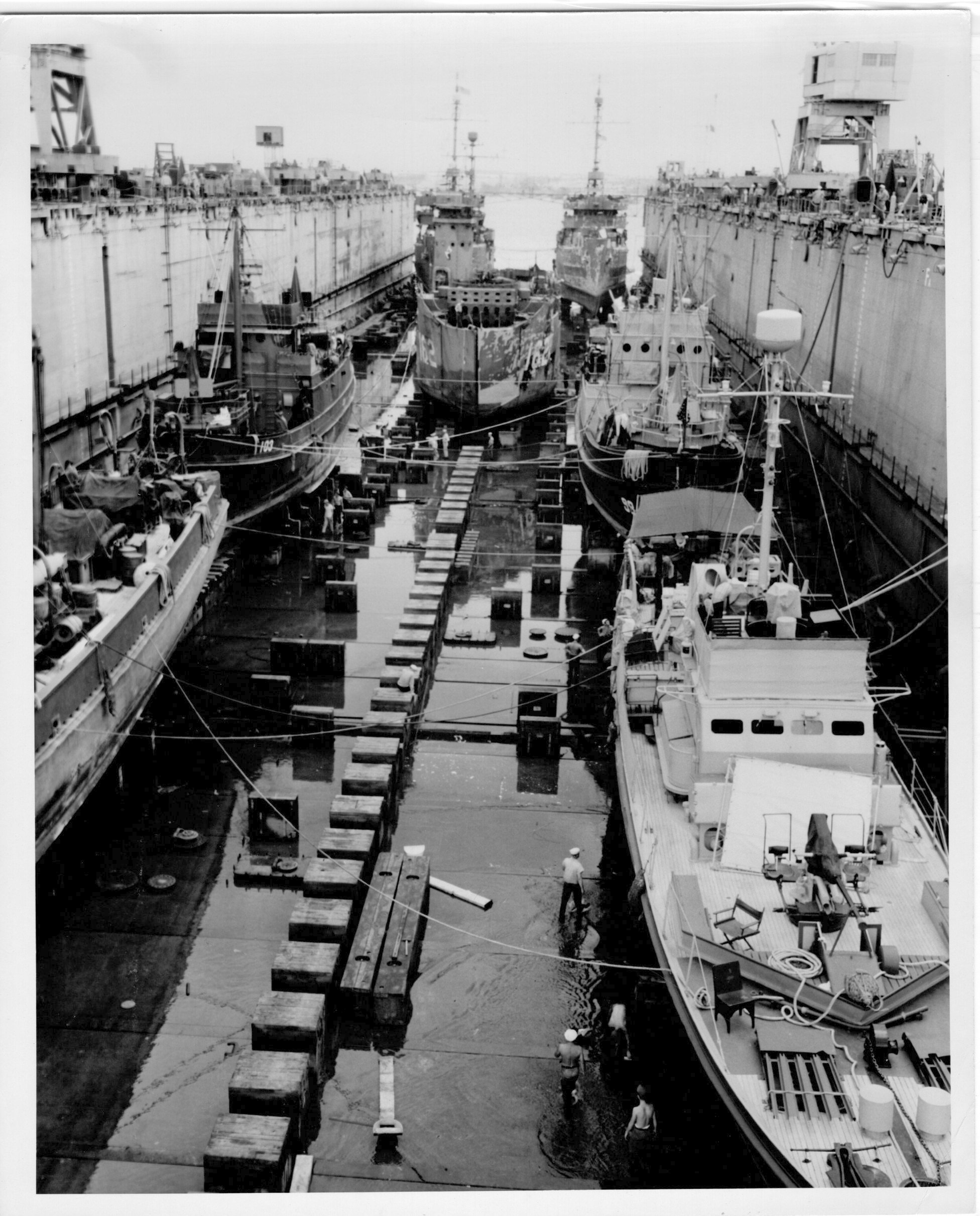 647k | USS ABSD-6 in Apria Harbor, Guan, October 1945 with (from back to front): YMS-357 and SC-1041; USS LSM-163; USS APc-103 and USS APc-98; Partial view of USS Spear (AM-322) an unidentified patrol craft aand USS Staff (AM-114) (not showning) in her dock. US Navy photo |