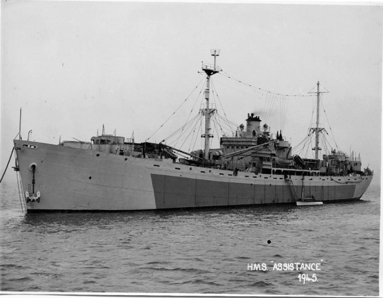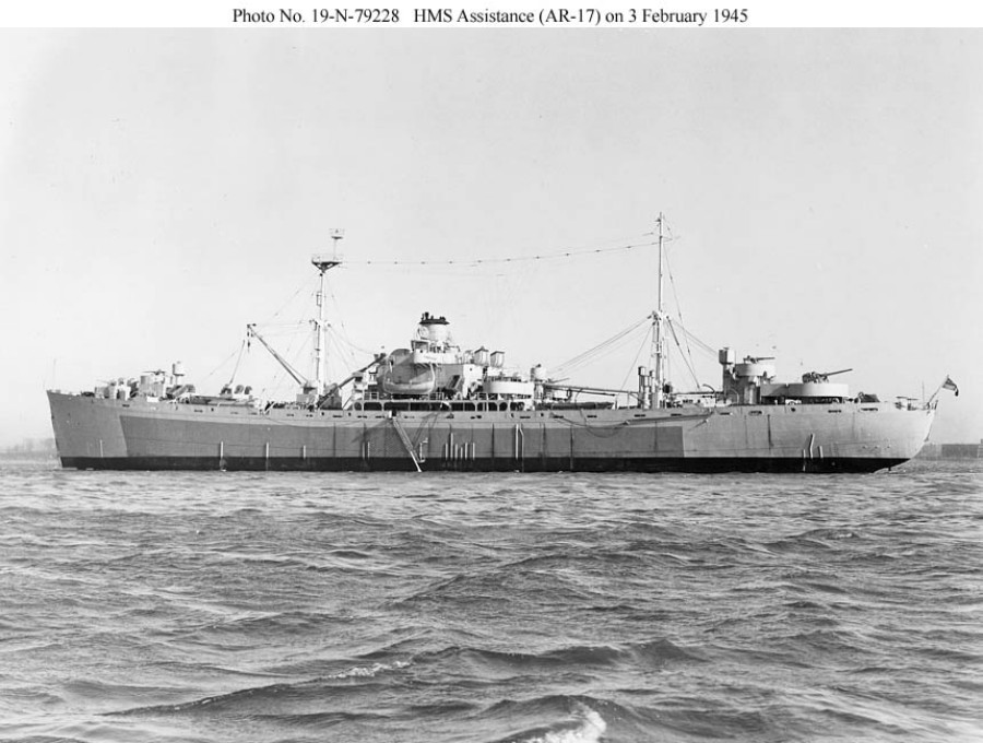 HMS Assistance (F-173) at anchor in Chesapeake Bay near Baltimore, MD., 3 February 1945. US National Archives photo # 19-N-79228, RG-18-LCM, a US Navy Bureau of Ships photo now in the collections of the US National Archives. |
