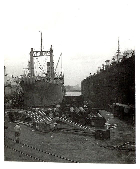 81k | Neptune (ARC-2) in drydock during conversion to a Cable Laying and Repair Ship at Bethlehem Steel Co. Shipyard, Key Highway Plant, Baltimore, MD., early 1953. | Photo by Gene Ruark, pre-commissioning crew | |