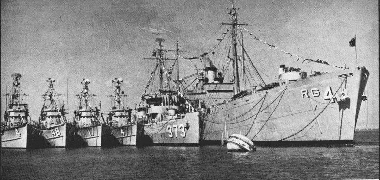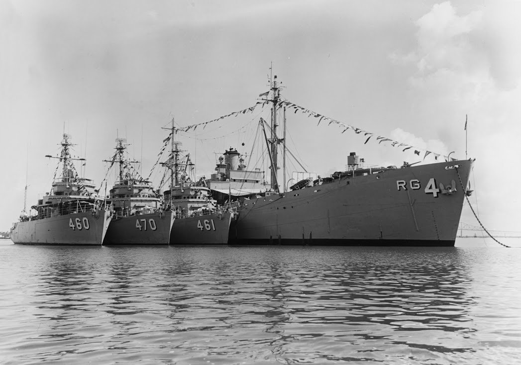 119k | USS Tutuila (ARG-4) with; USS Notable (MSO-460), USS Salute (MSO-470) and USS Observer (MSO-461 alongside while moored to a buoy off Naval Station Charleston, S.C., in 1964. U.S. Navy photo |
