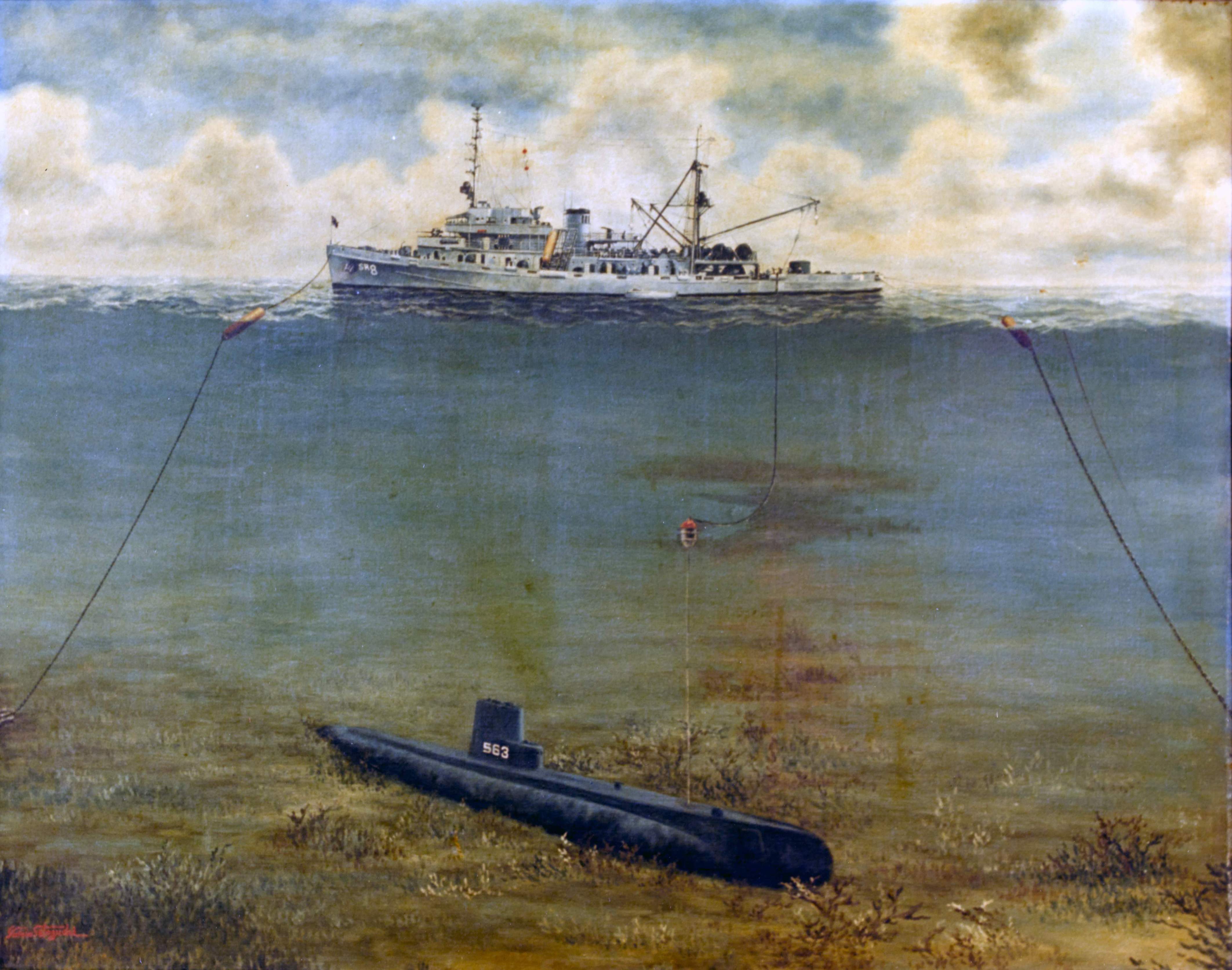 826k | Oil Painting of USS Coucal (ASR-8) moored over USS Tang (SS-563). lying sunk off Formosa. | US Naval History and Heritage Command photo # NH 85956-KN. | |