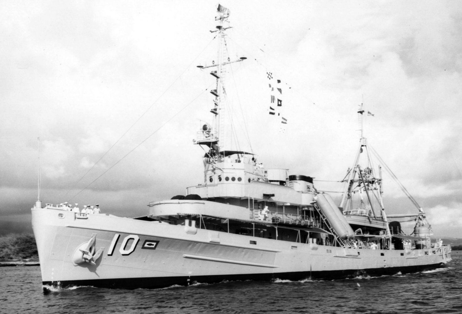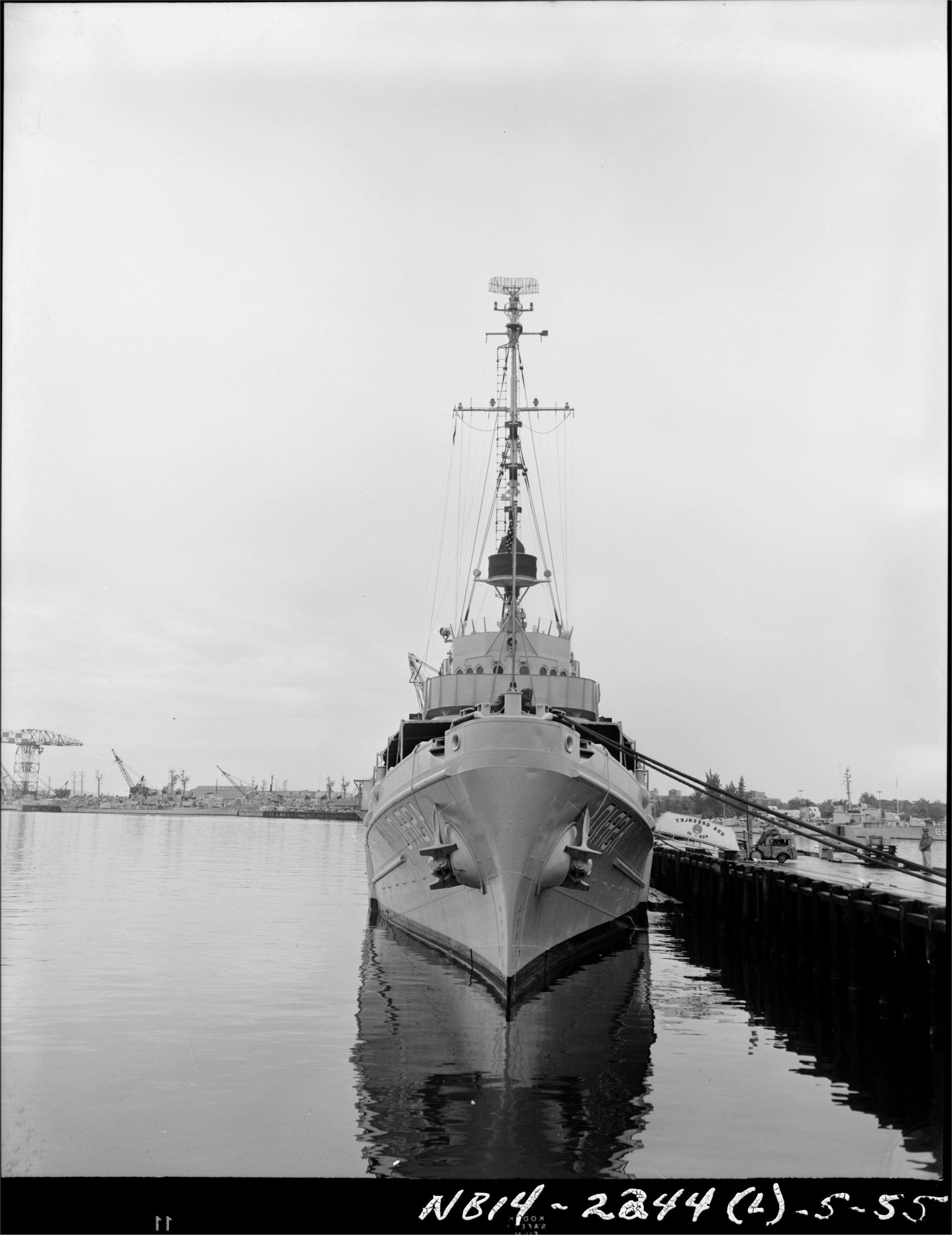527k | Bow view of USS Greenlet (ASR-10) at Naval Station Pearl Harbor, Hawaii, in May 1955. Identifiable among the ships in the background are the