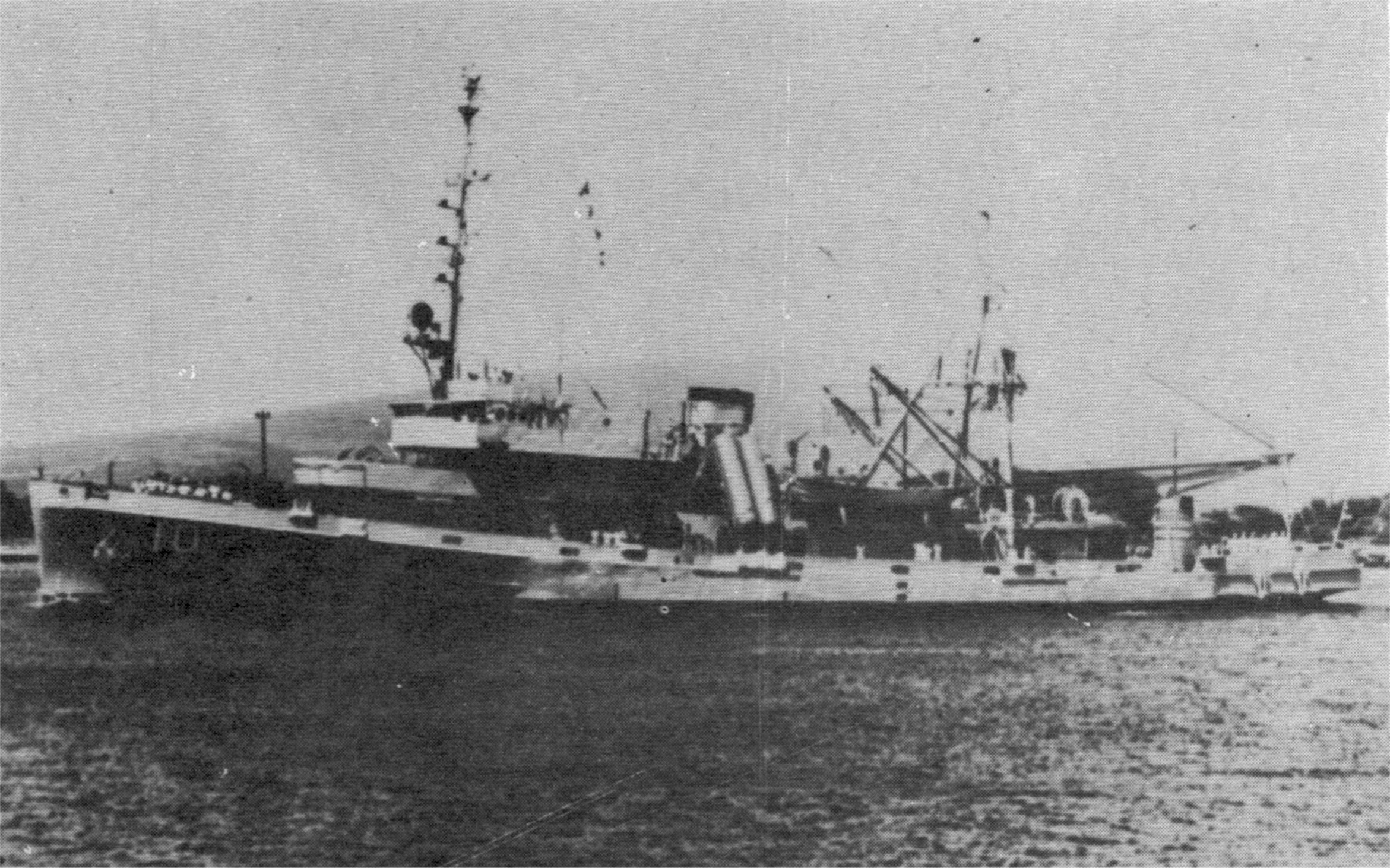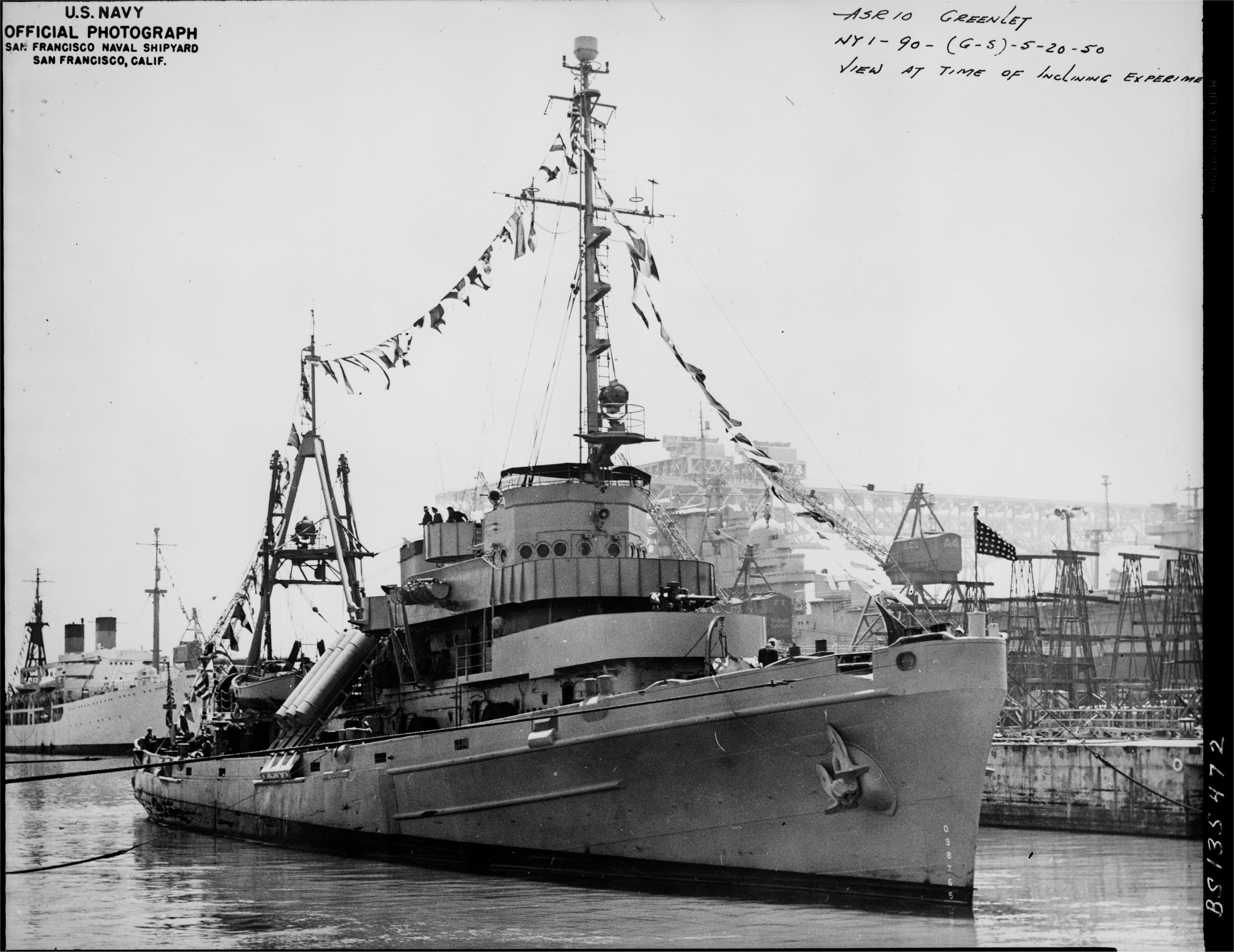 906k | USS Greenlet (ASR-10) at Hunters Point Naval Shipyard, San Francosco, CA. during inclining experiment, 20 May 1950.