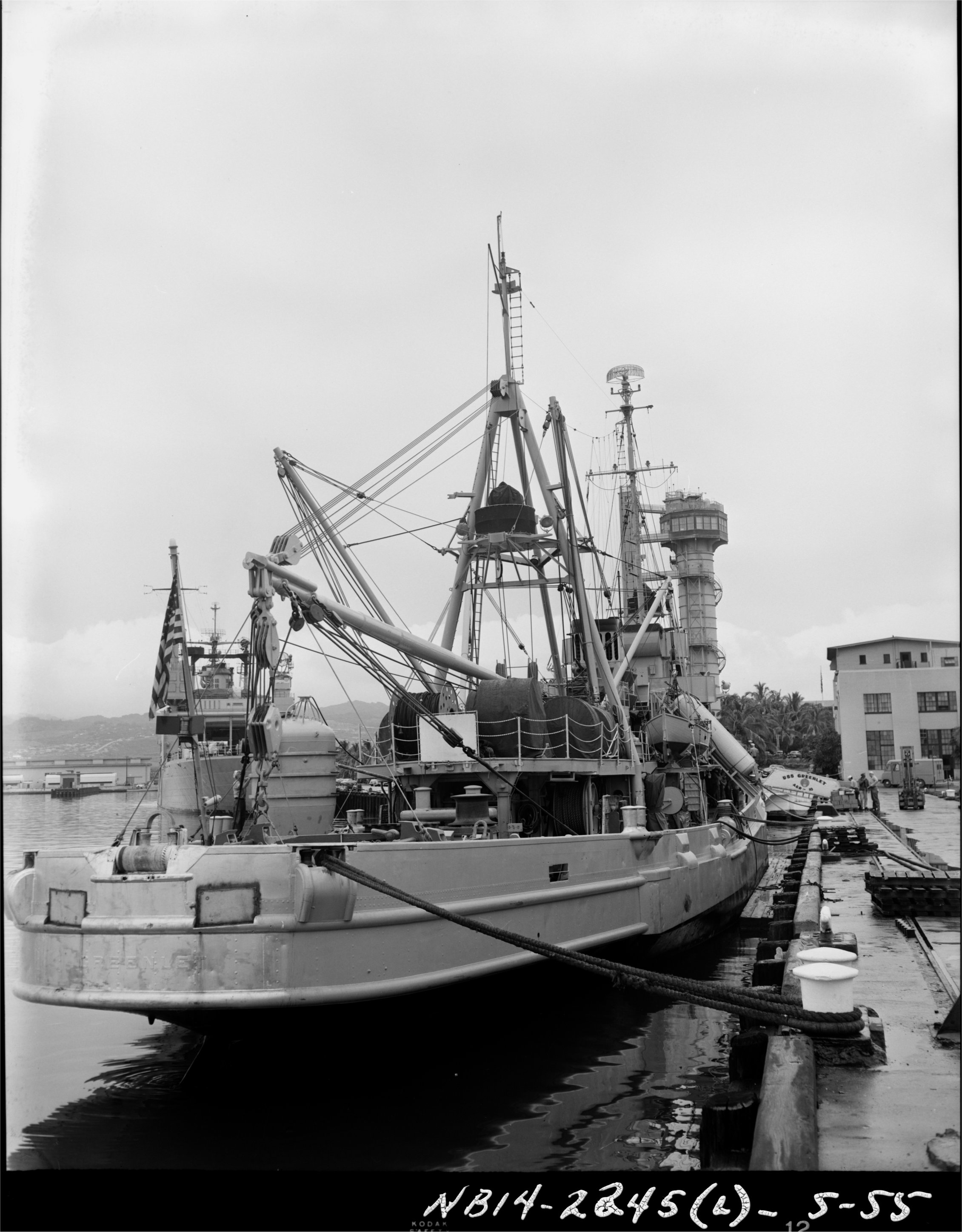 667k | Aft view of USS Greenlet (ASR-10) at Naval Station Pearl Harbor, Hawaii in May 1955. Note the Submarine Diver Training Tower in the background.