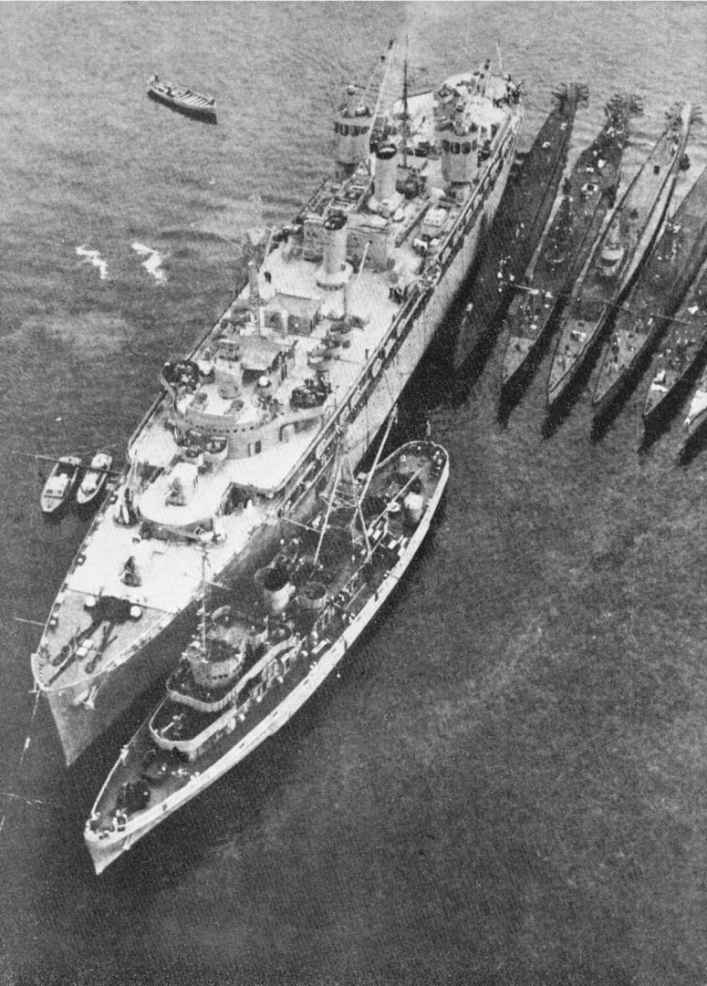 203k | Overhead photo of USS Sperry (AS-12) at San Diego, CA., circa 1950. In the photo are USS Greenlet (ASR-10) at Sperry's port bow with six of her squadrons submarines off her port side. US Navy photo from "All Hands" magazine, June 1950. |