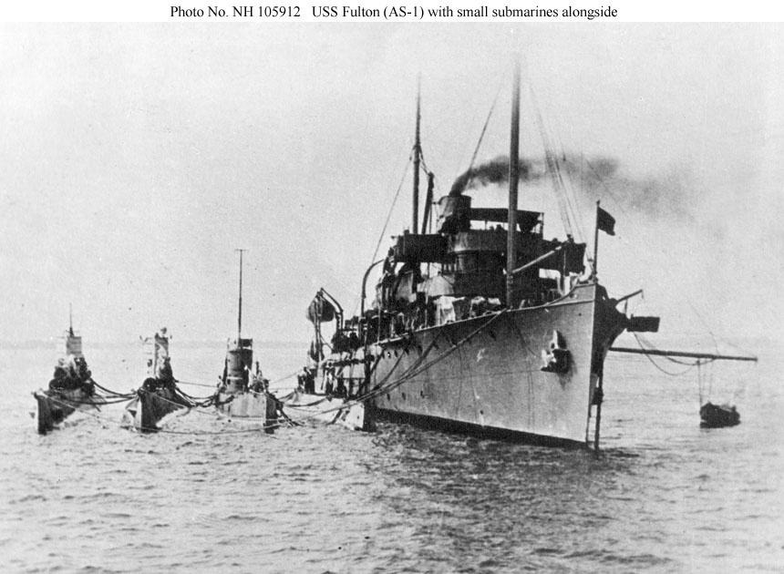 127k | USS Fulton (Submarine Tender #1) circa late 1917 with four submarines alongside.