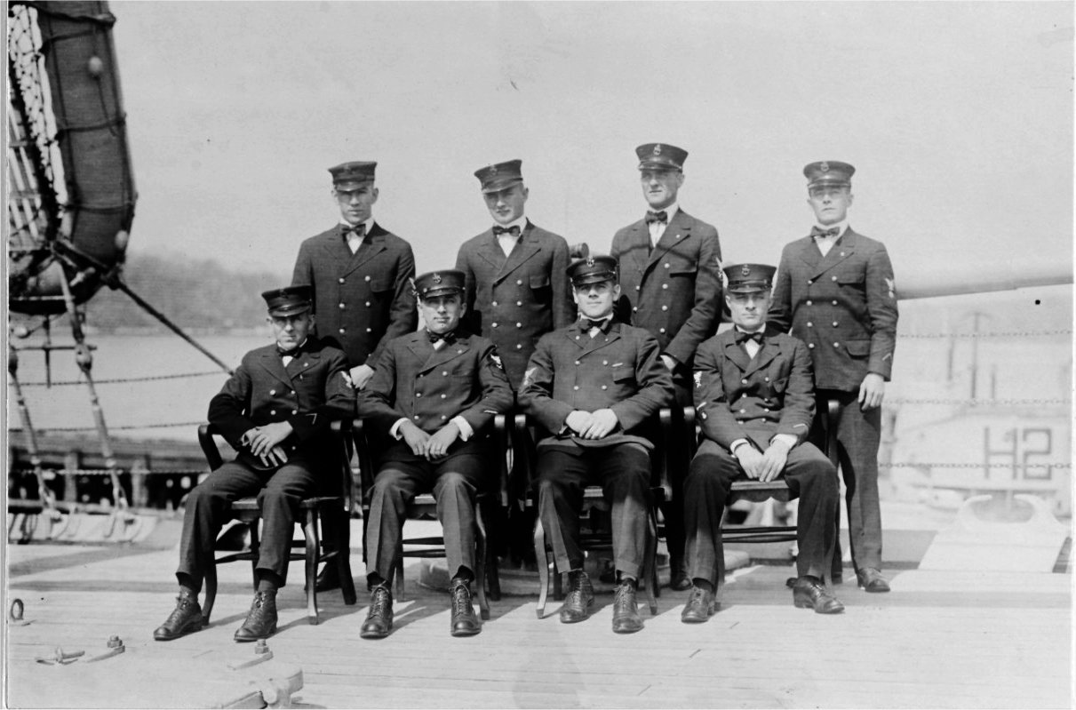 141k | USS Fulton (Submarine Tender #1) Officers photographed on board, at Submarine Base, New London, CT., circa 1919.