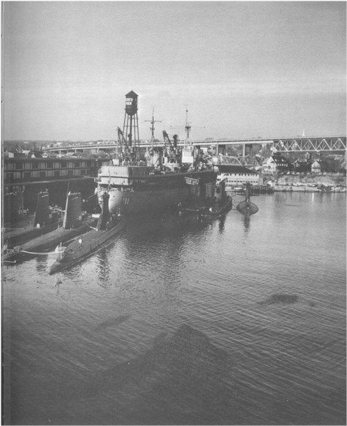 44k | USS Fulton (AS 11) at State Pier, New London, CT., date unknown with USS Skipjack (SSN-585), USS Sailfish (SSR-572), and USS Nautilus (SSN-571) alongside and USS Tusk (SS-426), USS Halfbeak (SS-352) and USS Entemedor (SS-340) astern. | Robert Hurst | |