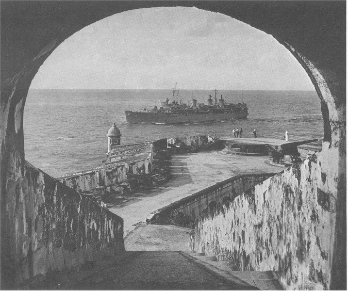 118k | USS Fulton (AS 11) viewed from El Morro Castle in San Juan, PR during Operation Springboard. Photo from Subron 10 Cruise Book for 1964-1965. | Fred Willshaw | |