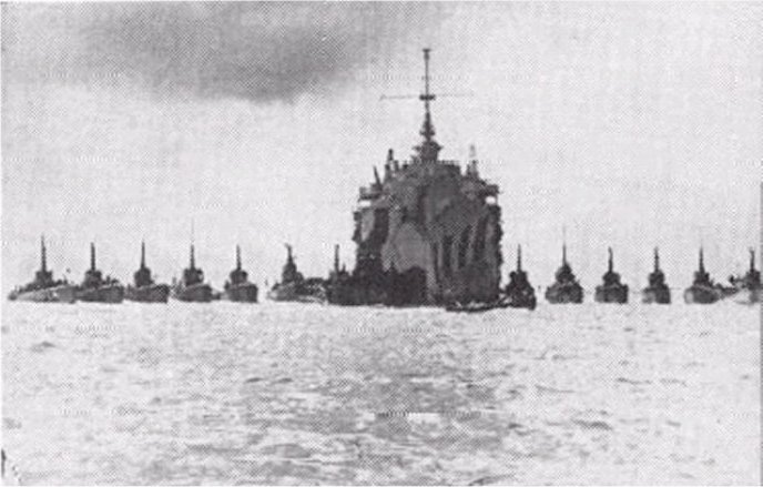 58k | USS Fulton (AS 11) at Saipan in 1944 with 13 submarines alongside. US Navy photo from "All Hands" magazine June 1956 |