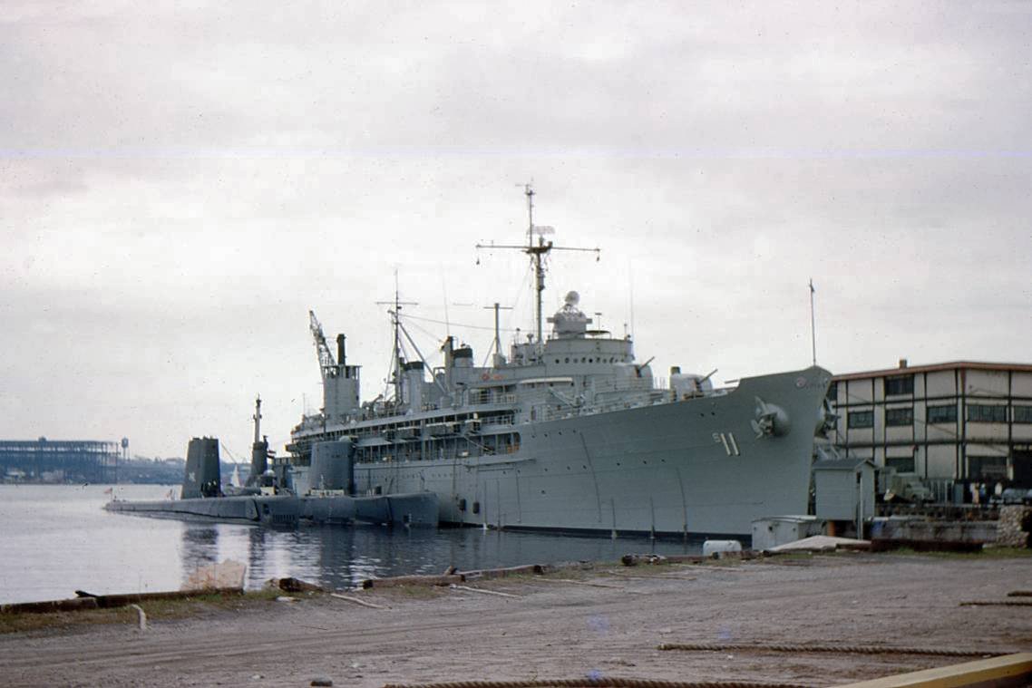 2958k | USS Fulton (AS 11) alongside the State Pier, New London, CT., circa 1967-69. At the end of the pier is the submarine rescue vessel