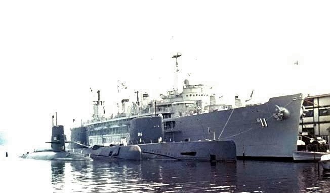 two nuclear submarines and USS Skylark (ASR-20) alongside. US Navy photo. |