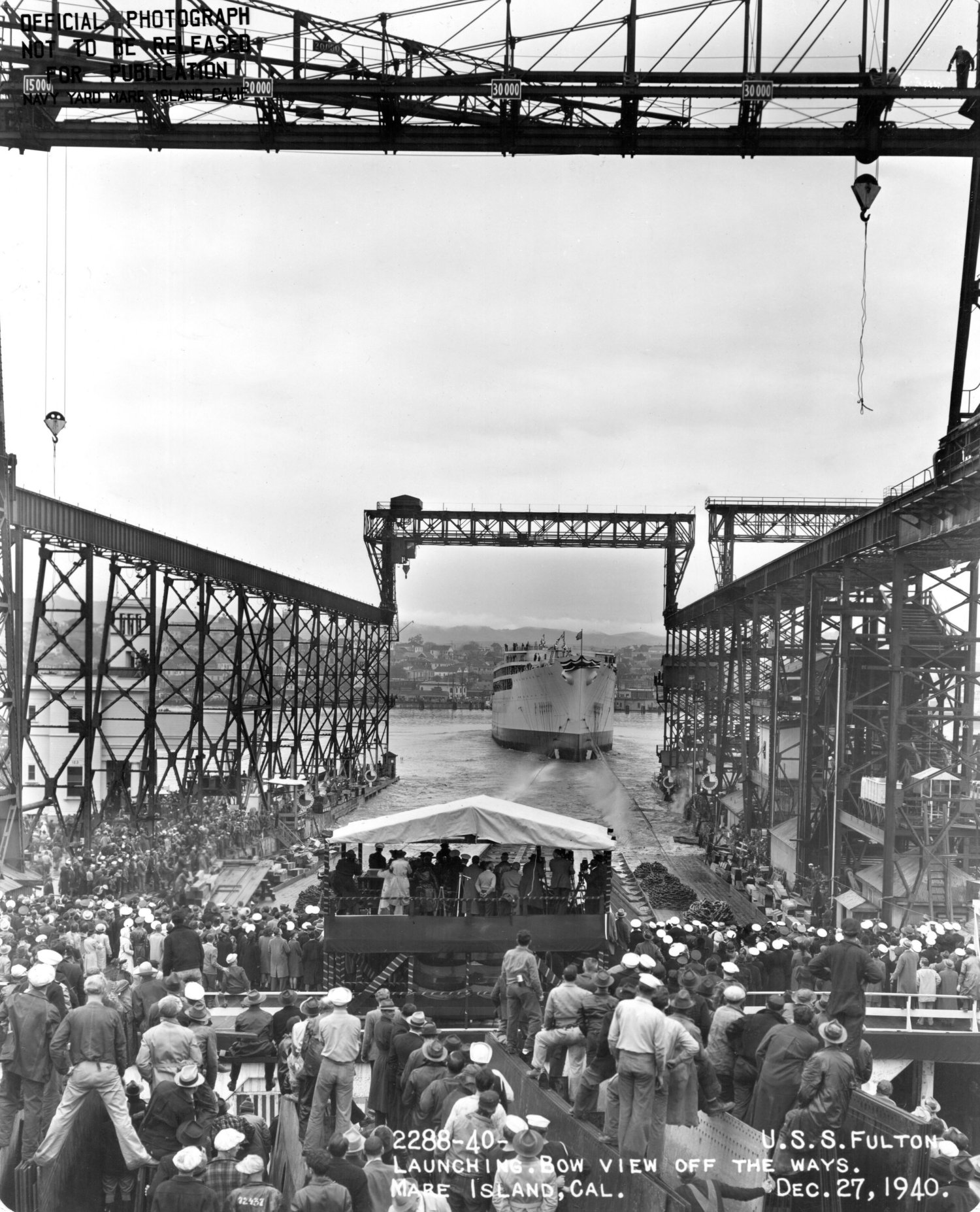 516k | Fulton (AS-11) christening and launching at Mare Island Navy Yard, 27 December 1940.