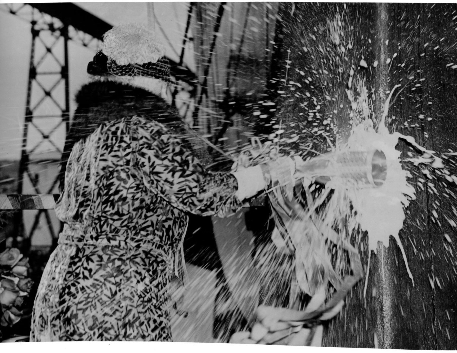 343k | Ship's Sponsor Mrs. A. T. Sutcliffe, great granddaughter of Robert Fulton, breaks the traditional bottle of Champagne across the bow of Fulton (AS-11) during the ship's christening and launching ceremony at Mare Island Navy Yard, 27 December 1940. | Dale Hargrave | |
