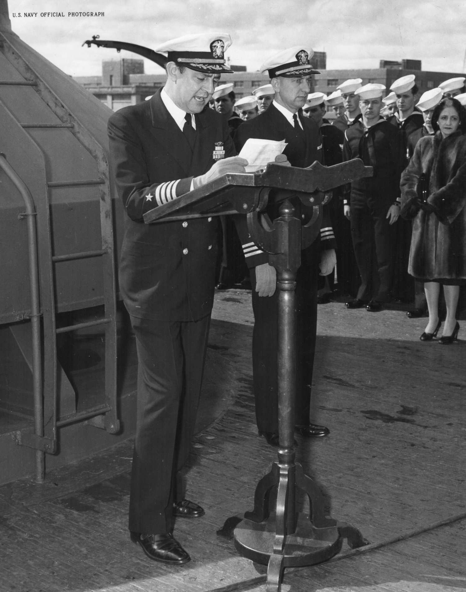 366k | CAPT. Augustus R. St. Angelo, USN Commanding Officer USS Fulton (AS-11), reading his orders placing ship to in-commission-in-reserve and turning