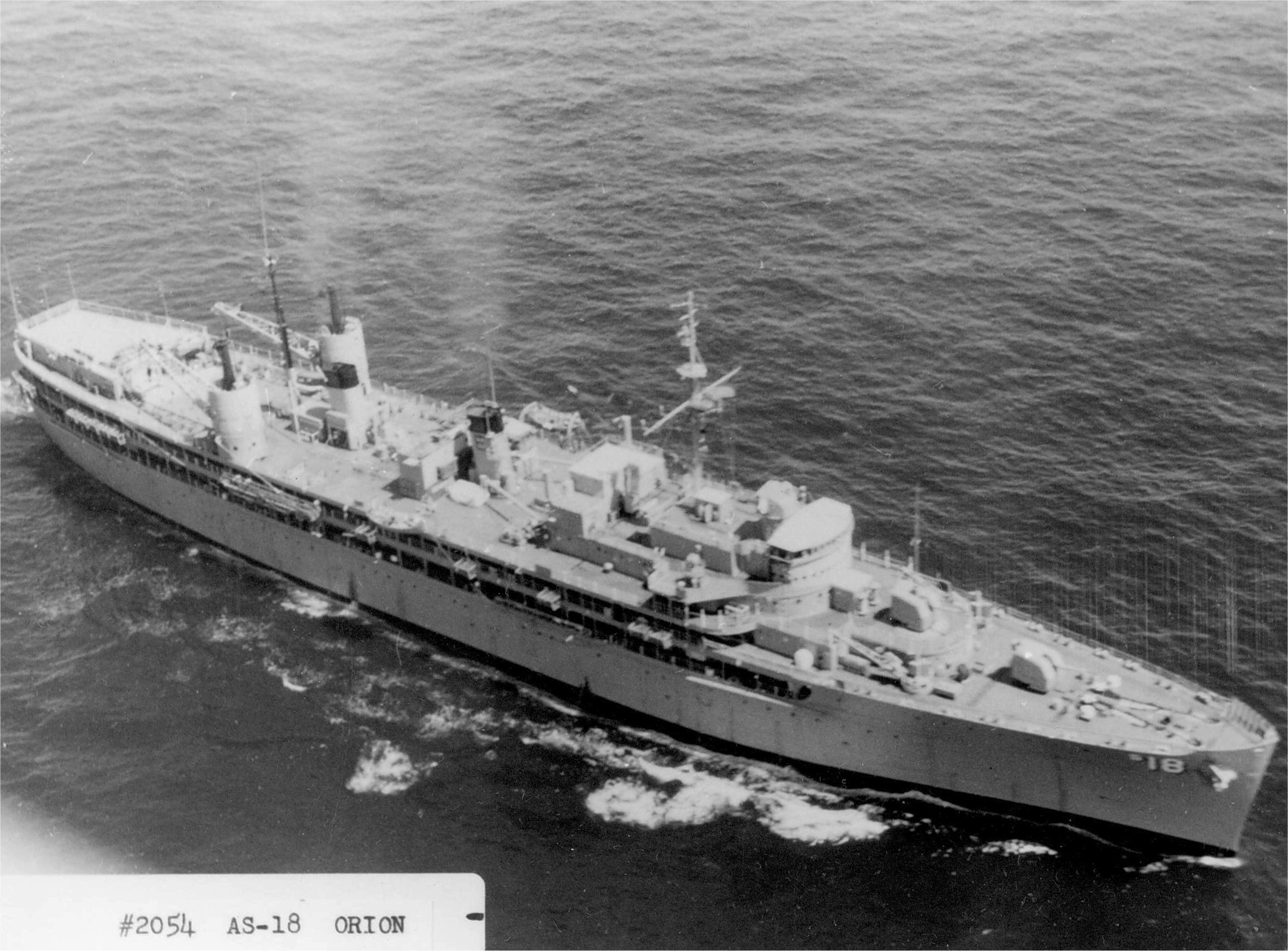 225k | USS Orion (AS-18) moored to a buoy, date and location unknown. US Navy photo. |