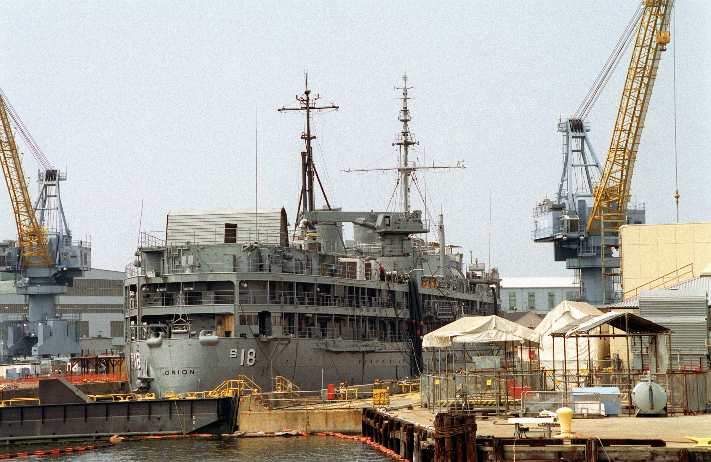 331k | Ex-USS Orion (AS-18) being prepared for preservation at Norfolk Naval Shipyard Portsmouth, VA., 8 September 1994. To the left of Orion is the amphibious assault ship USS Kearsarge (LHD-3) in overhaul. Department of Defense photo # DN-SC-95-01396 a US Navy photo by Don Montgomery, now in the collections of Defense Imagery.mil |