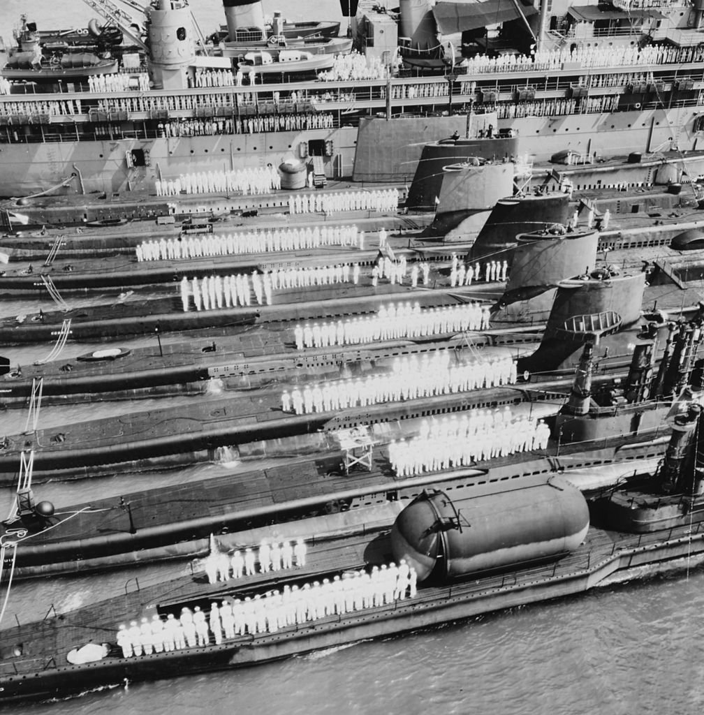 Note the two destroyers passing astern of the two tenders, crews of tenders and destroyers manning the rail and the blimp passing above.
