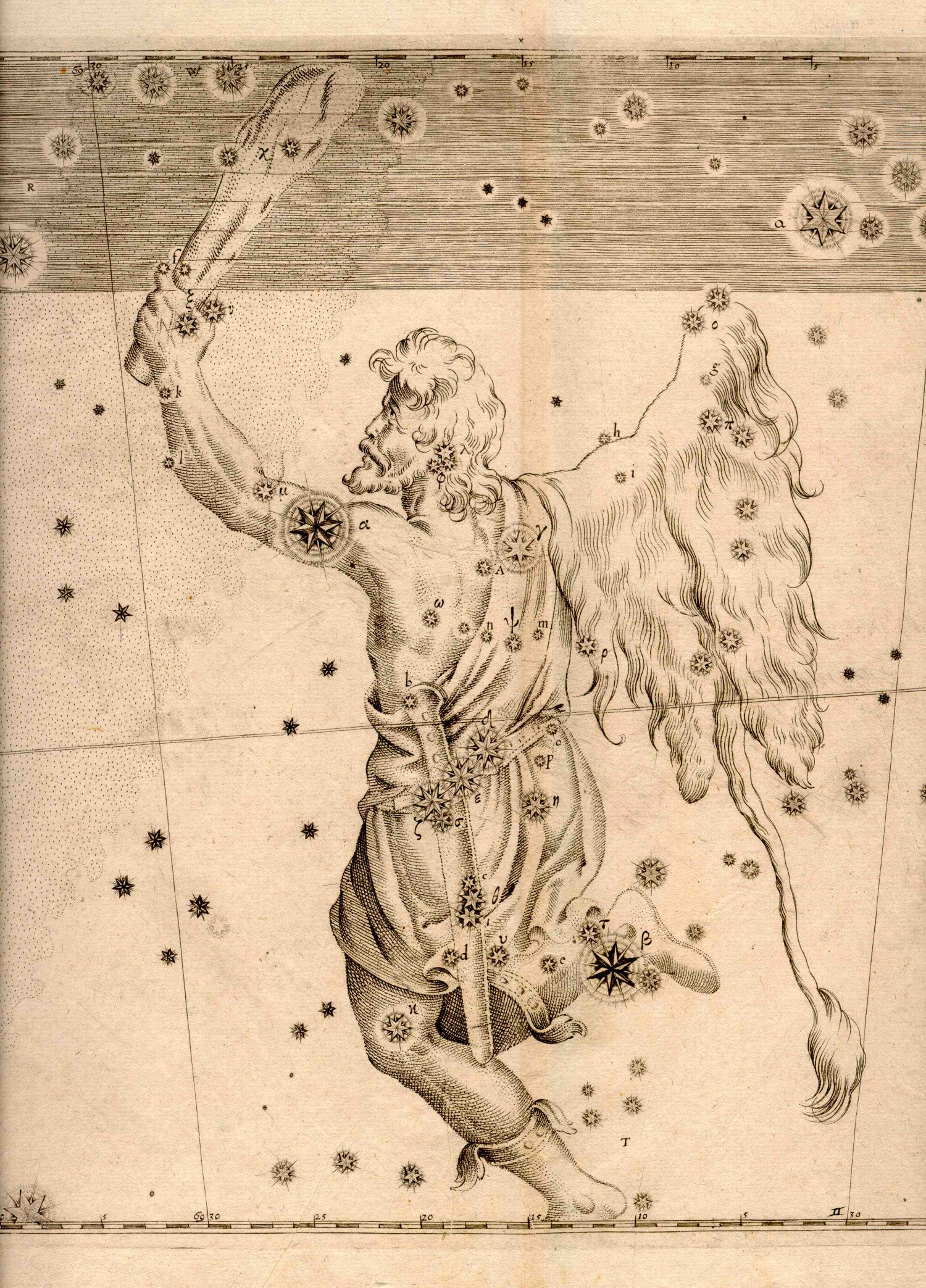1,021k | Print of the copperplate engraving for Johann Bayer's Uranometria (1661) showing the constellation Orion, courtesy of the United States Naval Observatory Library. |