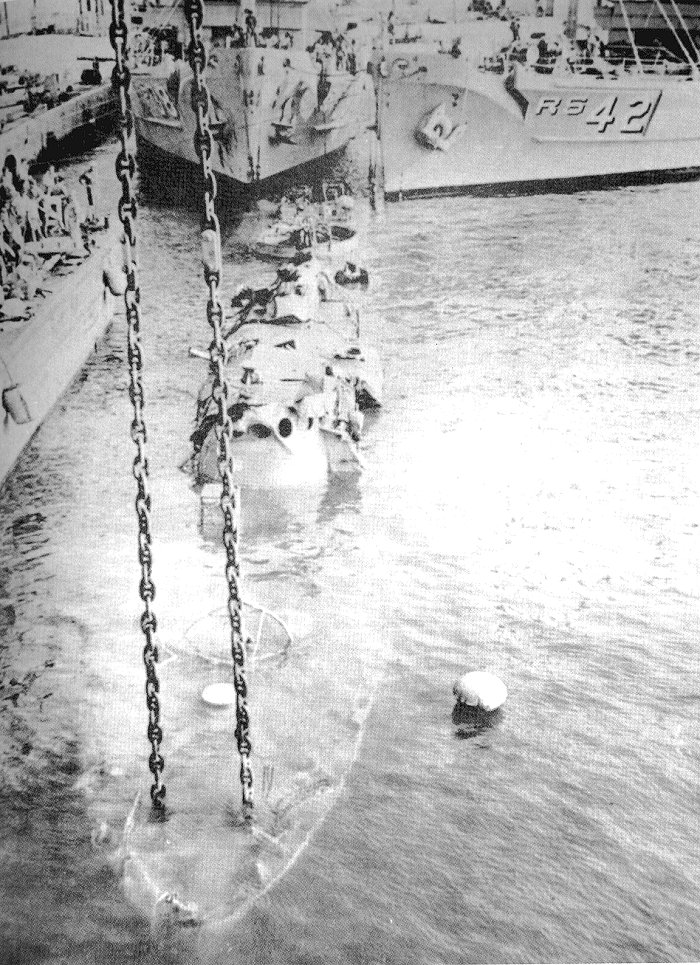 49k | The main deck of the ROK Han Ra San (PC 705) ex-USS PC-485 about to break the surface after being sunk at Guam by Typhoon Karen, November 1962. The salvage ships USS Bolster (ARS 38) and USS Reclaimer (ARS 42) are in the background. US Navy photo. |