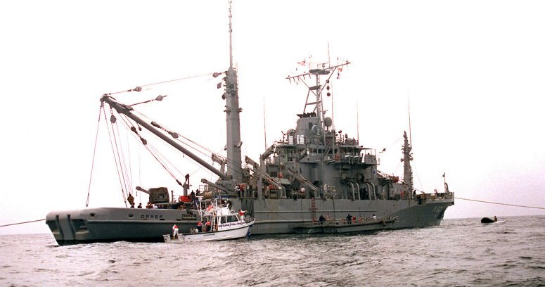 107k | USS Grasp (ARS-51) anchored over the crash site of TWA Flight 800 offshore of Moriches Inlet, Long Island, N.Y., she it conducts diving operations, 25 July 25, 1996. DOD photo |