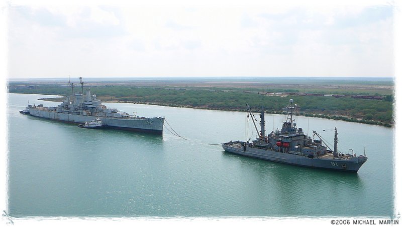 55k | USNS Grasp (T-ARS-51) tows ex-USS Des Moines (CA-134) up the Brownsville ship channel enroute to the ESCO scrapping yard, at Brownsville, TX., circa 2006. Photo ©Michael Martin, Brownsville, TX., 2006. |