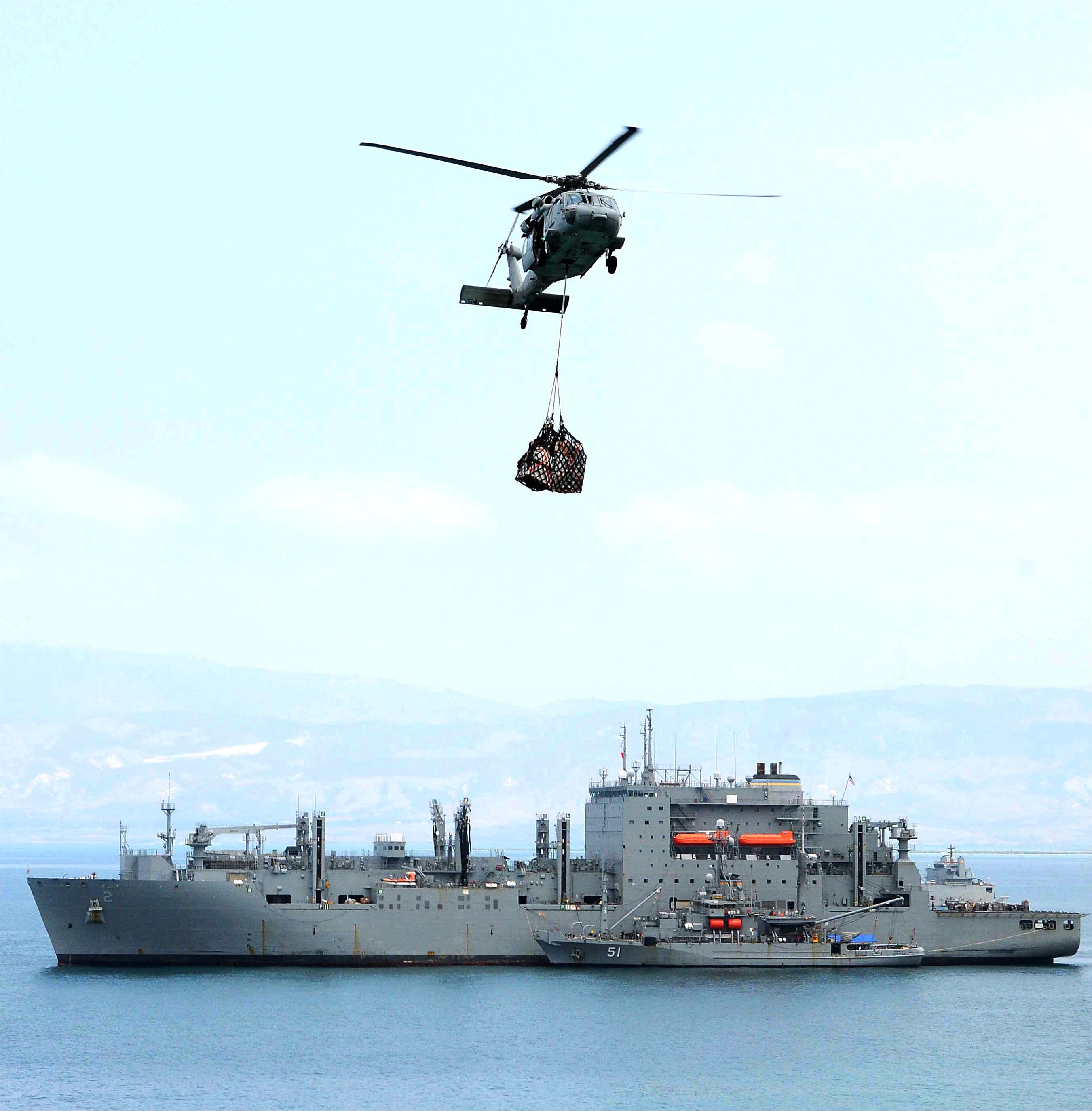 417k | USNS Grasp (T-ARS-51) lays alongside USNS Sacagawea (T-AKE-2) as an MH-60S Seahawk helicopter departs to deliver cargo to the hospital ship USNS Comfort (T-AH 20). Comfort received more than 200 pallets of supplies, which will allow the ship to support Operation Unified Response after a 7.0 magnitude earthquake struck near Port-au-Prince, Haiti January 12, 2010. US Navy photo # 100301-N-6410J-163 CARIBBEAN SEA (March 1, 2010) by MC3 Matthew Jackson. |