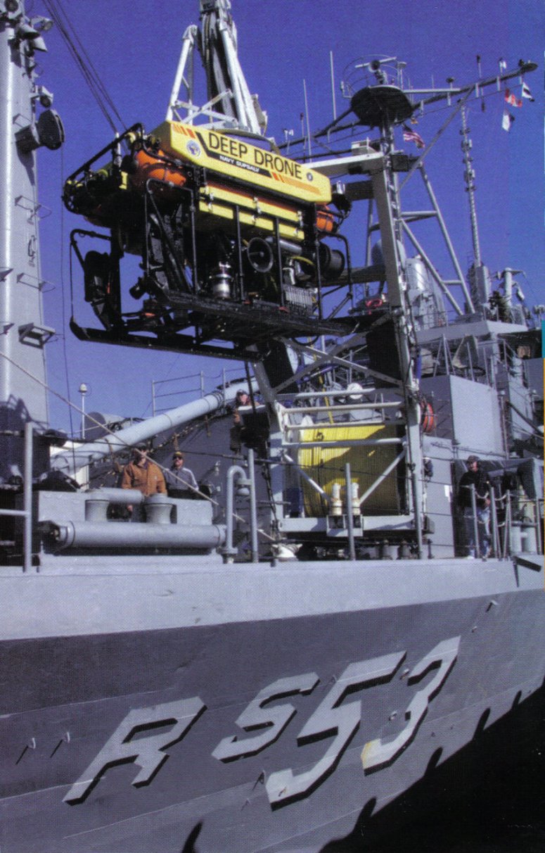 197k | USS Grapple (ARS-53) conducts underwater survey and recovery work using DRSV Drone 7200 at the 31 October 1999 crash site of Egypt Air Flight 990 off the coast of New England. US Navy photo |