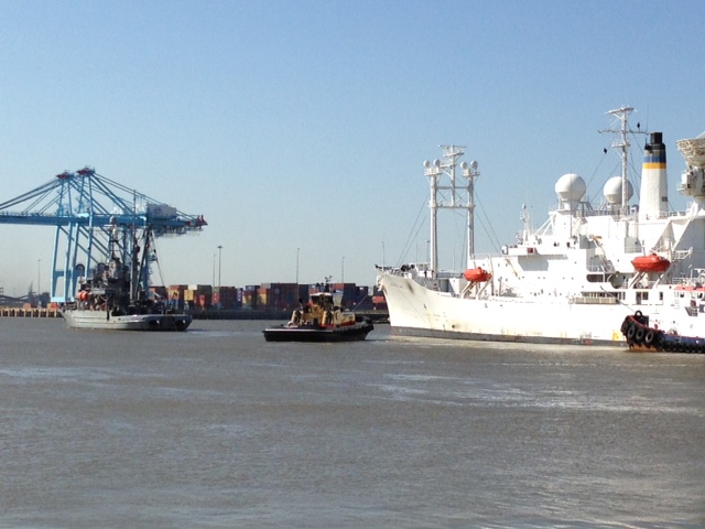 113k | USNS Grapple (T-ARS-53) departs Hampton Roads, 25 March 2014, with the de-activated USNS Observation Island (T-AGM-23) in tow. Grapple will deliver Observation Island to the National Defense Reserve Fleet, Beaumont, TX. | Lee Wahler | |
