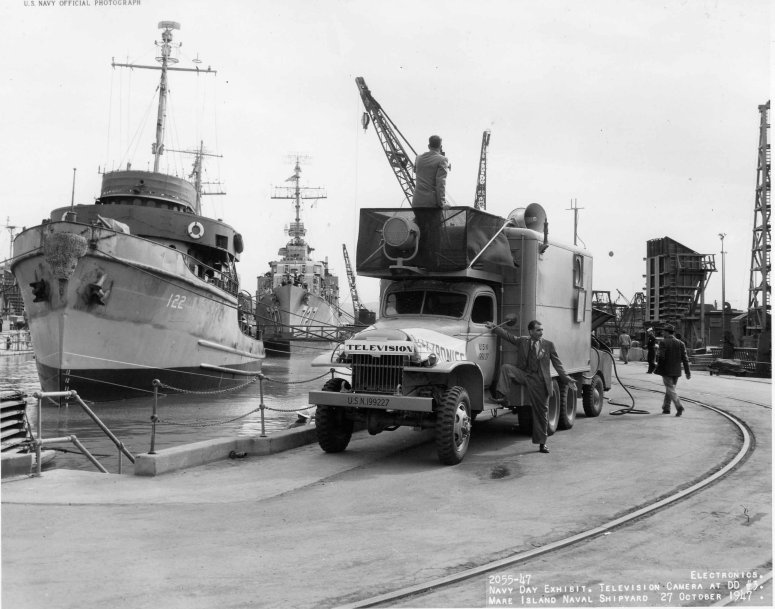 USS Mansfield (DD-728) are about to undock in Dry Dock # 3 at Naval Shipyard Mare Island, Vallejo, CA., 27 October 1947 - Navy Day Exhibit. Television Camera at Dry Dock #3. Mansfield is to the left of De Haven and behind ATA-122. US Naval Ship Yard Mare Island photo #2055-47 |