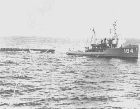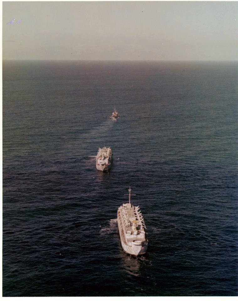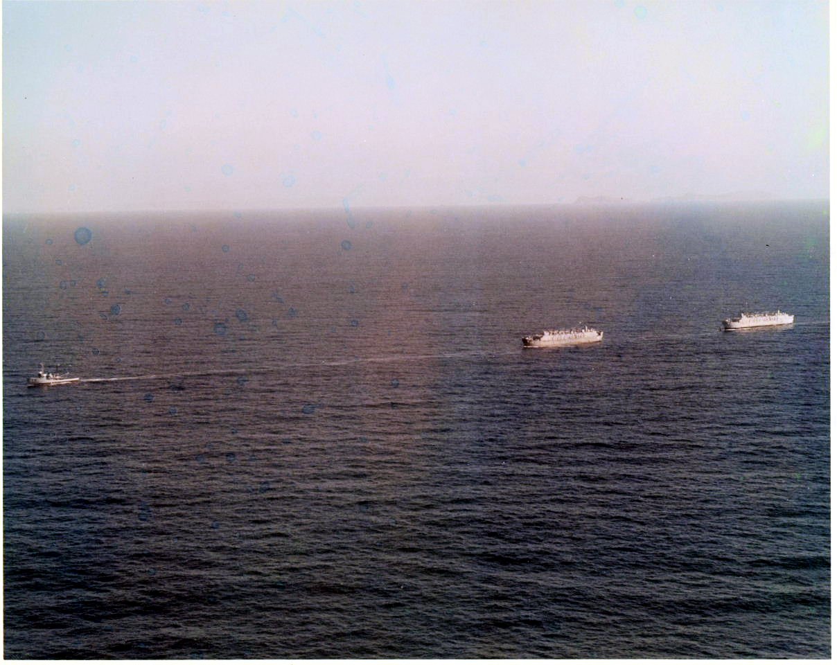 185k | Aerial views of USS Kalmia (ATA-184) under way off NAS North Island, San Diego Bay in the fall of 1967. Kalmia was towing two barracks ships from the Panama Canal to Long Beach and Port Hueneme. The barracks ships were being refurbished for use in Vietnam. At that time it was believed to be the longest tow to ever depart the Panama Canal. US Navy photos |