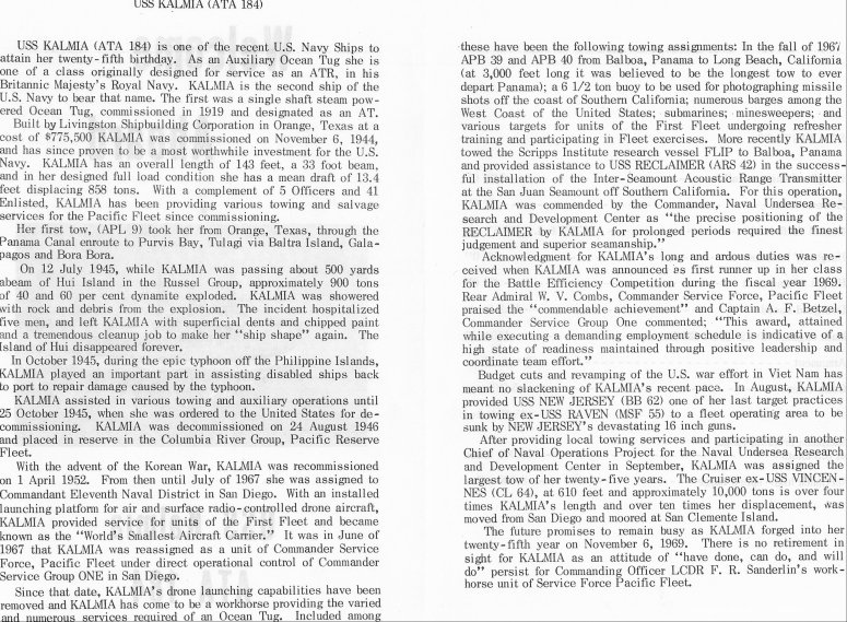 182k | USS Kalmia (ATA-184) "Welcome Aboard" pamphlet, inside pages, 1973. | Denns Colton USS Kalmia | |