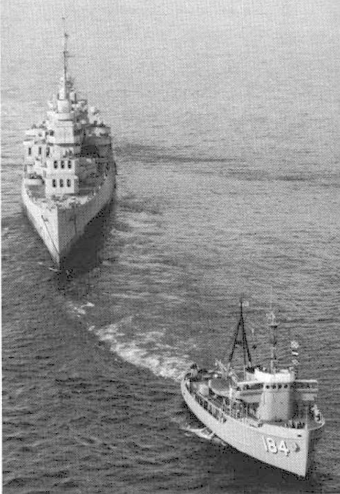 Muskegon (YTB-763) and Arawak (YTM-702) tow the old cruiser Ex-
