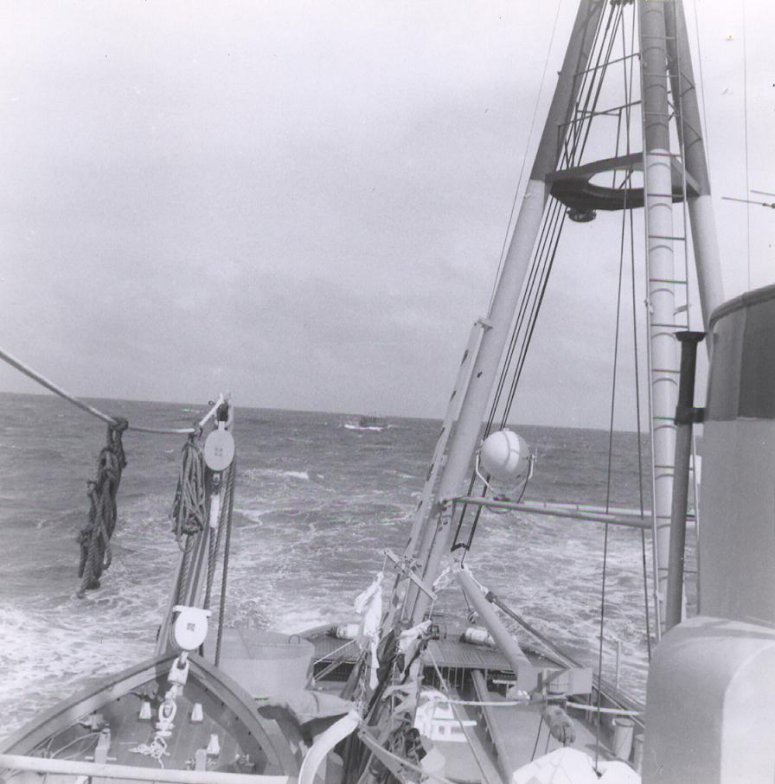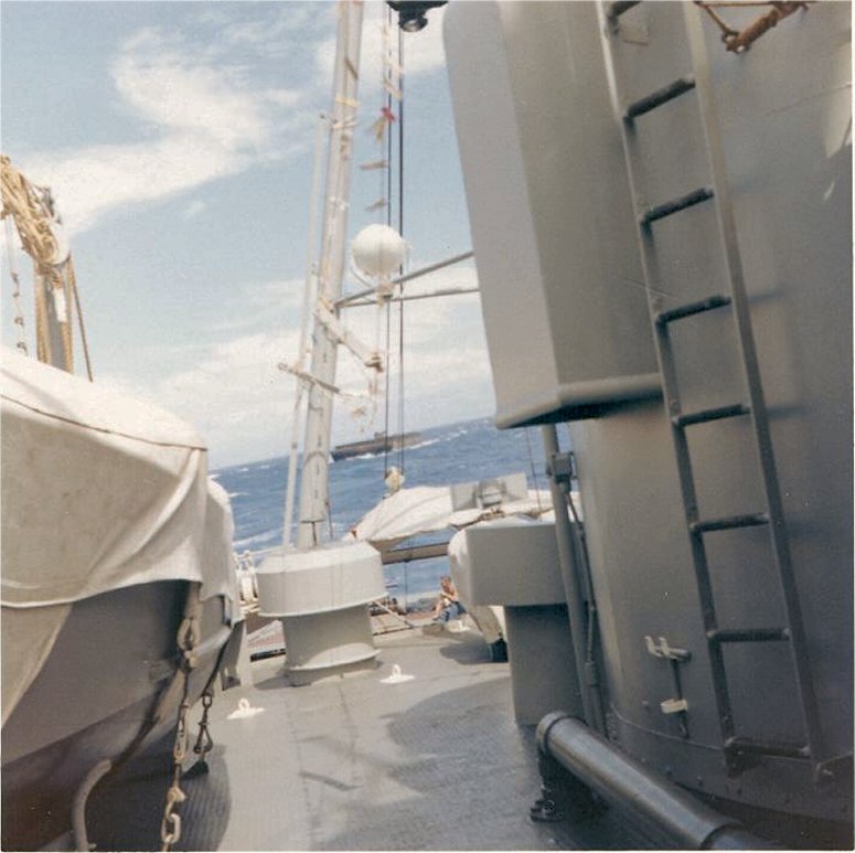 91k | USS Sunnadin (ATA-197) looking aft while enroute to Kwajalein Atoll with a barge in tow, date unknown | Photo by Charles Tremblay EN2 USN USS Sunnadin | |