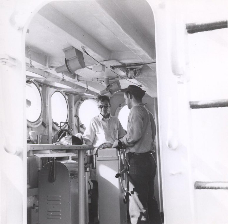 74k | USS Sunnadin (ATA-197) pilot house with an unidentified seaman and the ship's Executive Officer CWO4 Wylie, date unknown | Photo by Charles Tremblay EN2 USN USS Sunnadin | |