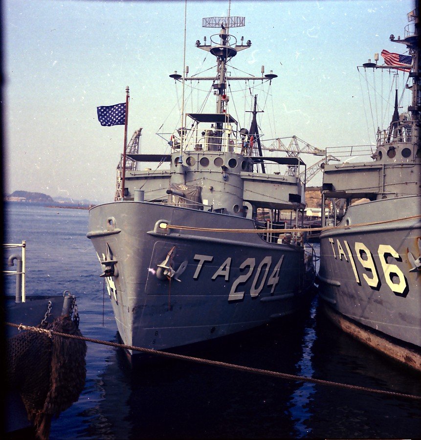 180k | USS Wandank (ATA-204) moored outboard of USS Mahopac (ATA-196) at Naval Base Yokosuka Japan in 1968 while training for a special ops mission. | Photo by Eli Blanco RM3, USS Wandank 1967-1968 | |