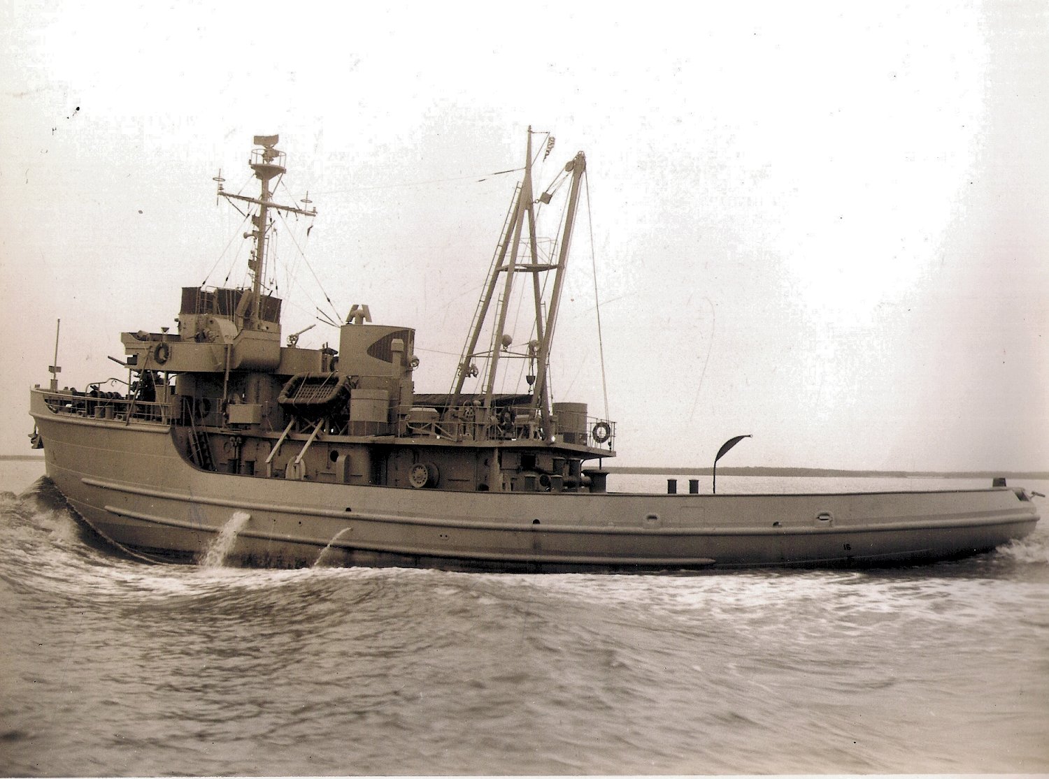 302k | Starboard bow view of ATA-204 underway during builders trials near Port Arthur, TX. in January 1945. Photo from the files of Gulfport Shipyard, Port Arthur TX (formerly known s Gulfport Boiler and Iron Works) |