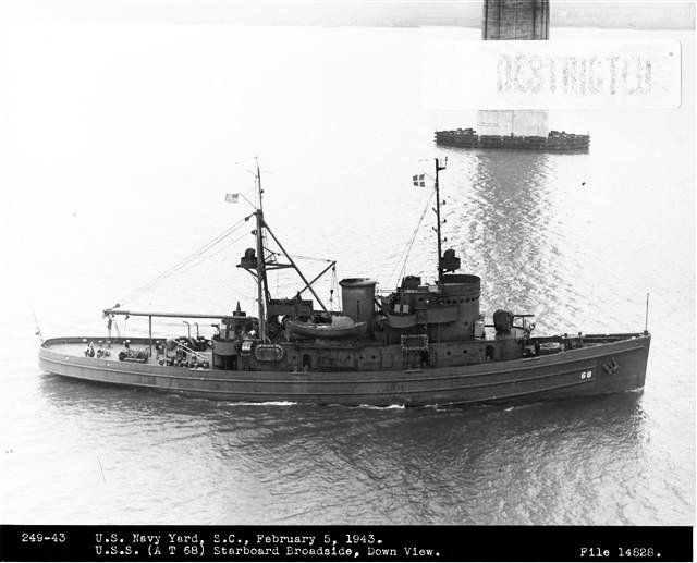 38k | Starboard quarter view of USS Arapaho (AT-68) underway on the Cooper River off Navy Yard Charleston, S. C., 5 February 1943. US Navy Yard Charleston, S.C. photo # 246-43 |