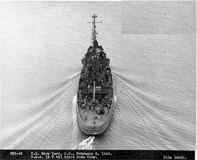 72k | Stern down view of USS Arapaho (AT-68) underway on the Cooper River off Navy Yard Charleston, S. C., 5 February 1943. US Navy Yard Charleston, S.C. photo # 251-43 |