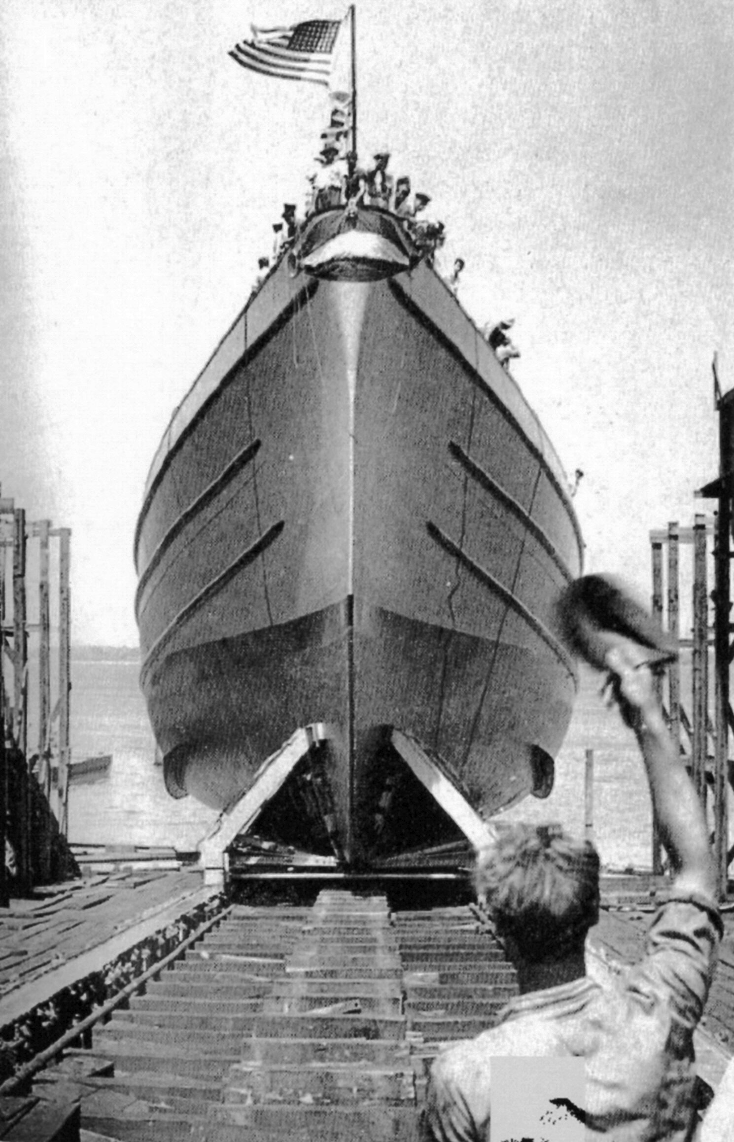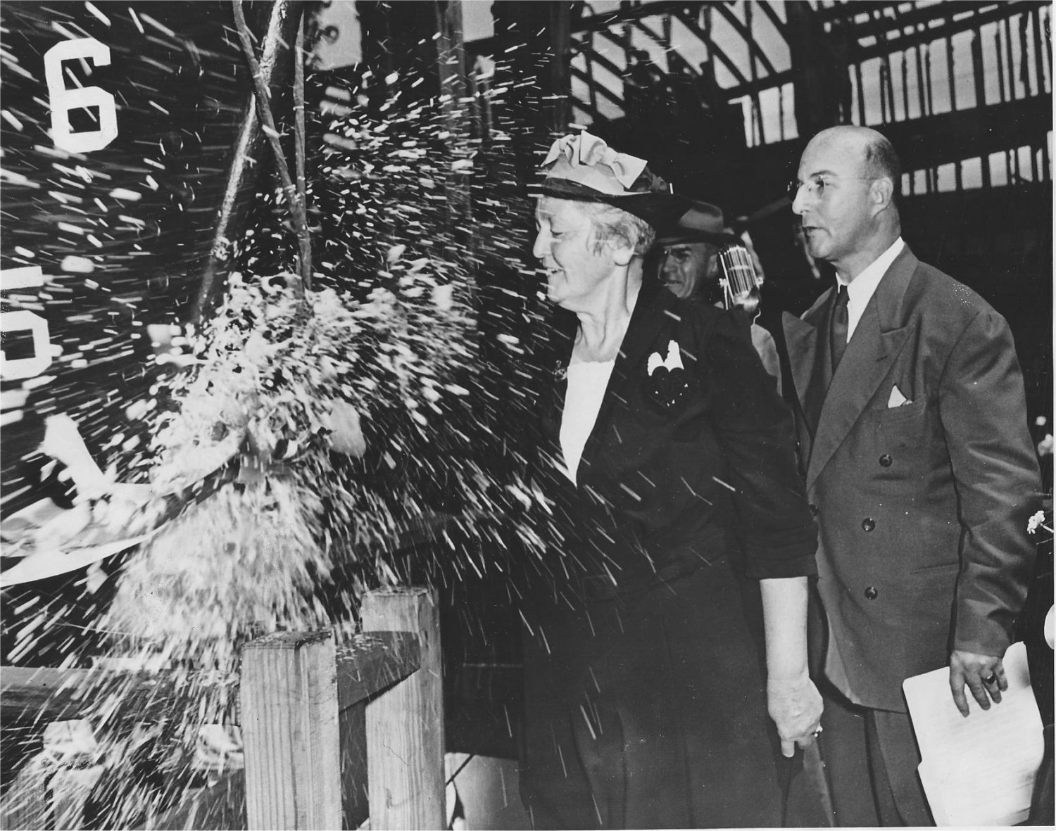331k | Mrs. Alice Posey Hatcher, ship's sponsor, breaks the traditional bottle of Champagne across the bow of Arapaho (AT-68) during launching ceremonies , 22 June 1942, at Charleston Shipbuilding and Dry Dock Co., Charleston, S.C. US Navy Bureau of Ships photo |