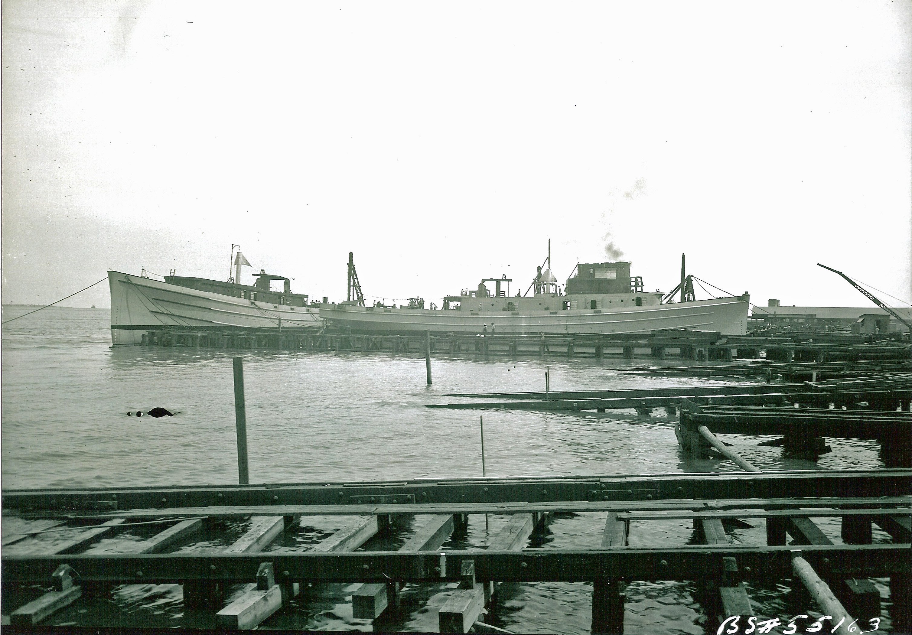 1208k | Arapaho (AT-68) (left) and Apache (AT-67) (right) fitting out at Charleston Shipbuilding & Drydock Co, Charleston S.C., July 1942. US National Archives photo # 19-N-55163 a US Navy Bureau of Ships photo now in the collections of the US National Archives. |