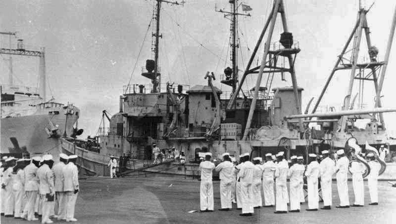 63k | Hand over and commissioning ceremony (inboard to outboard) ARA Comandante General Zapiola (R-41) (ex-USS Arapaho (ATF-68) and ARA Comandante General Irigoyen (R-40) (ex-USS Cahuilla (ATF-152) at Naval Station San Diego, CA., 9 July 1961. Photo courtesy of Ignacio Amendolara and National Association of Fleet Tug Sailors. | Robert Hurst | |