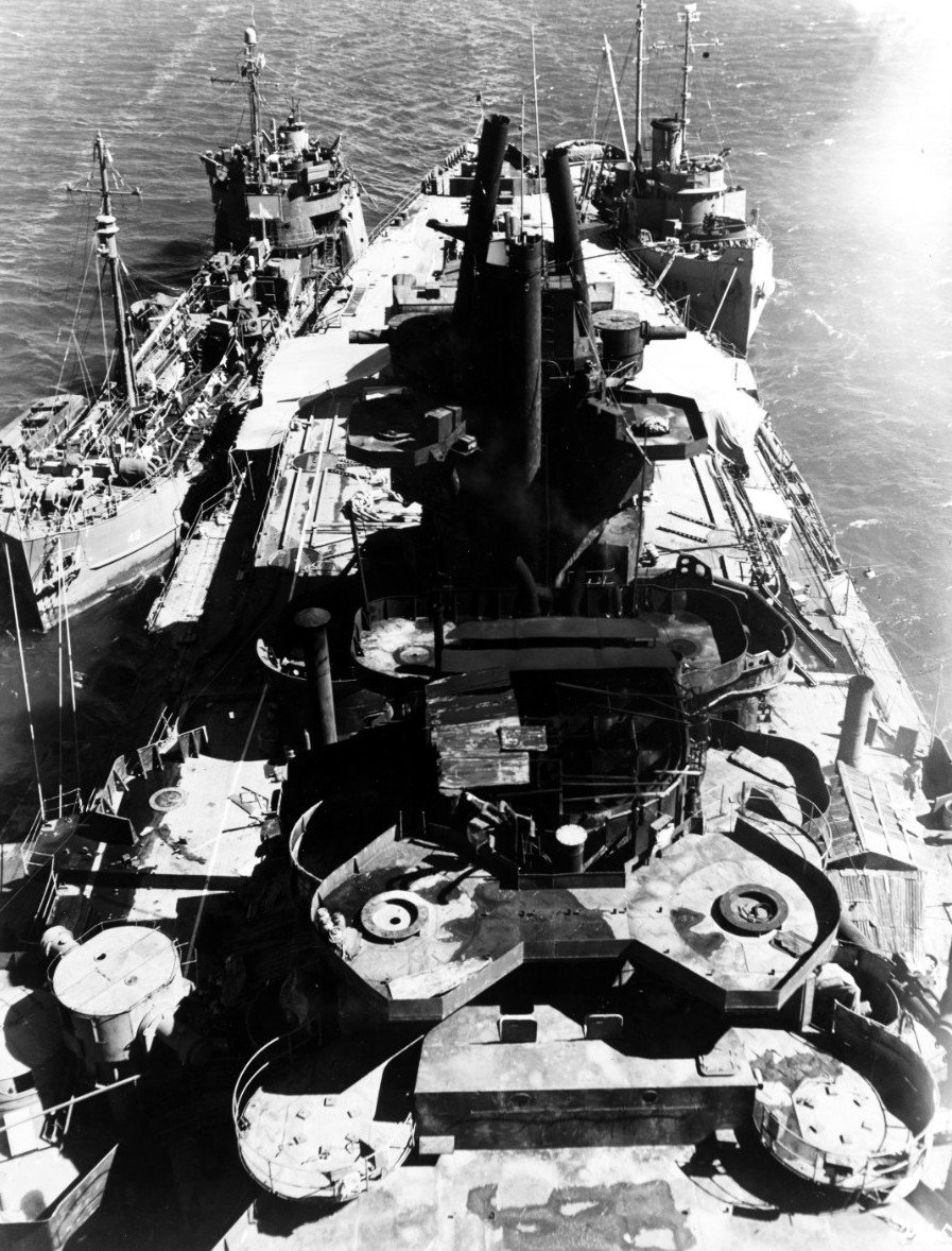 Waupaca (AOG-46) is moored to starboard. United States National Archives, Photo No. SC 216513 |