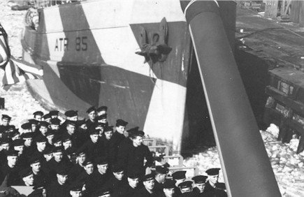 ATR-1 32k USS ATR-85 serves as a background for a commissioning ceremony of an unidentified ATR moored forward of her, at Island Dock Inc, Kingston, N.Y., circa January-February 1944.